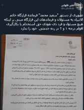 به گزارش پایگاه خبری تحلیلی گرو، یک فعل رسانه ای در توییتر تصویری از دیتور سعید محمد فرمانده قرارگاه خاتم الانبیاء به مسئولان و فرماندهان این قرارگاه درباره استخدام اقوام را منتشر کرد.
