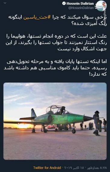 به گزارش پایگاه خبری تحلیلی گرو، یک فعال رسانه ای در صفحه شخصی خود درتوییتر درباره رنگ آمیزی جت آموزشی یاسین نوشت: