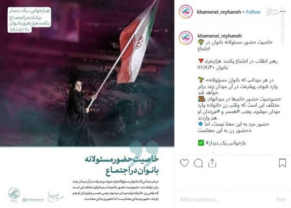به گزارش پایگاه خبری تحلیلی گرو، صفحه اینستاگرام ریحانه منتسب به دفتر حفظ و نشر آثار مقام معظم رهبری، بخشی از بیانات رهبر انقلاب در اجتماع یکصدهزار نفری بانوان در استادیوم آزادی را منتشر کرد.