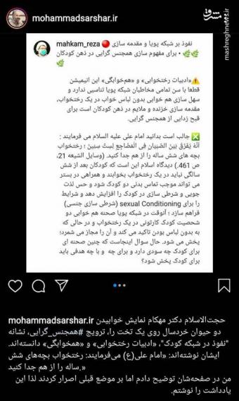 به گزارش پایگاه خبری تحلیلی گرو، محمد سرشار مدیر شبکه کودک پویا در صفحه اینستاگرامی خود نوشت: حجتالاسلام دکتر مهکام نمایش خوابیدن دو حیوان خردسال روی یک تخت را، ترویج همجنس گرایی، نشانه "نفوذ در شبکه کودک"، «ادبیات رختخوابی» و «همخوابگی» دانستهاند. ایشان نوشتهاند: «امام علی(ع) میفرمایند: رختخواب بچههای شش ساله را از هم جدا کنید.»