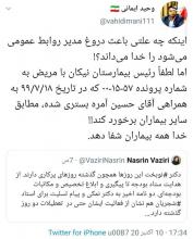 اما لطفاً رئیس بیمارستان نیکان با مریض به شماره پرونده ۵۷-۱۵-۰۰ که در تاریخ ۹۹/۷/۱۸ به همراهی آقای حسین آمره بستری شده، مطابق سایر بیماران برخورد کند!!