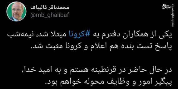 به گزارش پایگاه خبری تحلیلی گرو، محمد باقر قالیباف در توییتر نوشت: یکی از همکاران دفترم به کرونا مبتلا شد، نیمهشب پاسخ تست بنده هم اعلام و کرونا مثبت شد. در حال حاضر در قرنطینه هستم و به امید خدا، پیگیر امور و وظایف محوله خواهم بود.