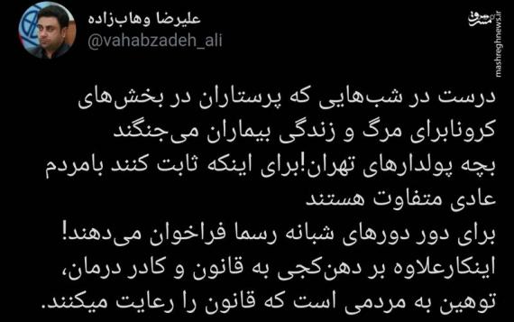 به گزارش پایگاه خبری  تحلیلی گرو، علیرضا وهاب زاده مشاور وزیر بهداشت درباره دوردورهای شبانه در ساعات محدودیت کرونایی در توییتی نوشت: درست در شب‌هایی که پرستاران در بخش‌های کرونابرای مرگ و زندگی بیماران می‌جنگند