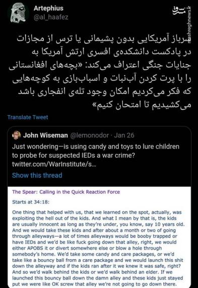 به گزارش پایگاه خبری تحلیلی گرو، یک کاربر فضای مجازی در توییتر نوشت: سرباز آمریکایی بدون پشیمانی یا ترس از مجازات در پادکست دانشکدهی افسری ارتش آمریکا به جنایات جنگی اعتراف میکند: «بچههای افغانستانی را با پرت کردن آبنبات و اسباببازی به کوچههایی که فکر میکردیم امکان وجود تلهی انفجاری باشد میکشیدیم تا امتحان کنیم»