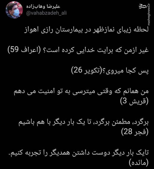 به گزارش پایگاه خبری تحلیلی گرو، علیرضا وهاب زاده مشاور وزیر بهداشت با انتشار لحظه زیبای نماز ظهر در بیمارستان رازی اهواز نوشت: غیر ازمن که برایت خدایی کرده است؟ (اعراف ۵۹)
