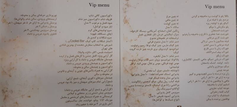 سه منو به ما دادند، منوی سیلور، منوی طلایی و منوی وی آی پی؛ تاکید کردند که منوی سیلور را برای عروسی هایی که در شش ماهه اول سال برگزار می شود توصیه نمی کنیم چون منوی سطح پایینی است و افرادی که عروسیشان را در شش ماهه ابتدایی سال برگزار می کنند افراد لاکچری و سطح بالایی هستند، خواستیم تا منوی وی آی پی را برای ما رزرو کنند و توضیحات بیشتری درباره این منو به ما بدهند، همانطور که «پیام» منو را تشریح می کرد، نگاهی به منوی وی آی پی انداختم، از شیر مرغ تا جان آدمیزاد در منو پیدا می شد، دقیقا یاد مراسم های اشرافی و سلطنتی در اروپا که از عکس ها و فیلم هایش در فضای مجازی منتشر می شود، افتادم!منویی با بیش از ۲۵ غذای ایرانی و خارجی که می توانید در تصویر ببینید