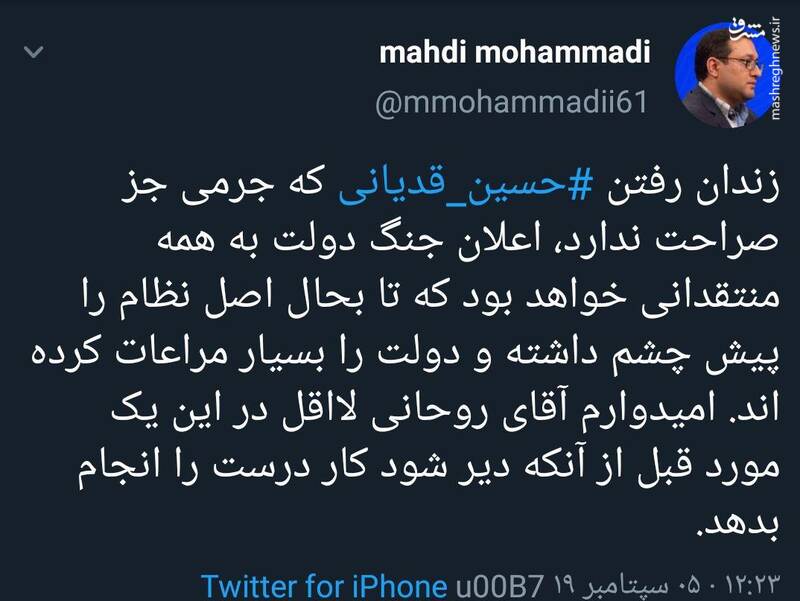 به گزارش پایگاه خبری تحلیلی گرو، مهدی محمدی تحلیلگر مسائل سیاسی در تازه ترین پست توییتری خود درباره بازداشت حسین قدیانی نوشت: