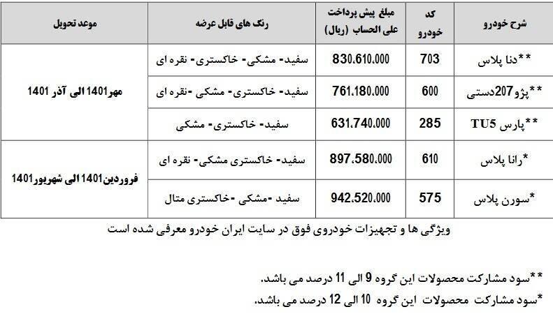 موعد تحویل خودروها از فروردین تا آذر ۱۴۰۱ پیش بینی شده است. سود مشارکت درنظر گرفتهشده نیز بر اساس نوع محصول از ۹ تا ۱۲ درصد متفاوت خواهد بود.