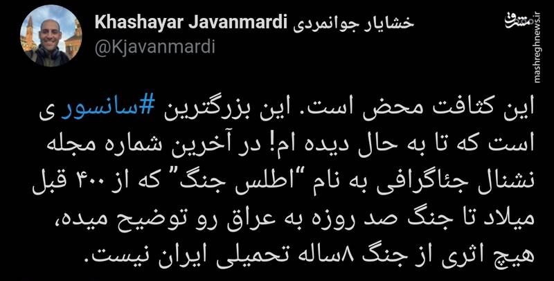 به گزارش پایگاه خبری تحلیلی گرو، خشایار جوانمردی، عکاس درباره سانسور نشریه نشنال جئوگرافیک طی توییتی نوشت: این بزرگترین سانسوری است که تا به حال دیده ام! در آخرین شماره مجله نشنال جئوگرافیک به نام “اطلس جنگ” که از ۴۰۰ قبل میلاد تا جنگ صد روزه به عراق رو توضیح میده، هیچ اثری از جنگ ۸ساله تحمیلی ایران نیست.