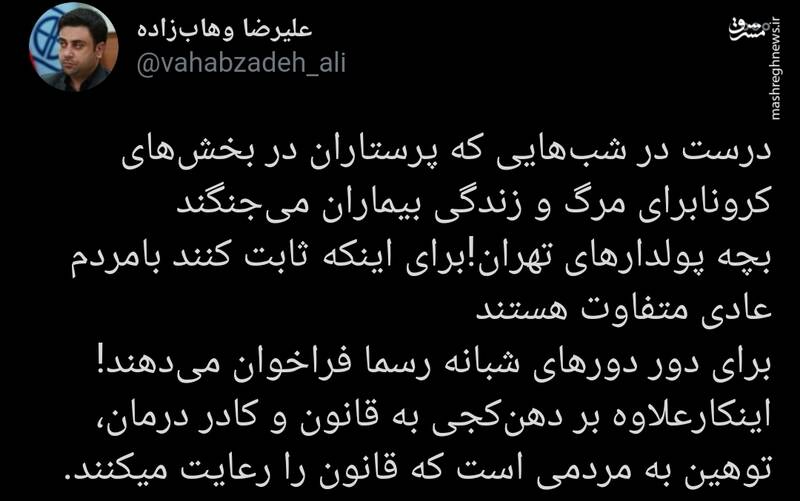 به گزارش پایگاه خبری تحلیلی گرو، علیرضا وهاب زاده مشاور وزیر بهداشت درباره دوردورهای شبانه در ساعات محدودیت کرونایی در توییتی نوشت: درست در شبهایی که پرستاران در بخشهای کرونابرای مرگ و زندگی بیماران میجنگند