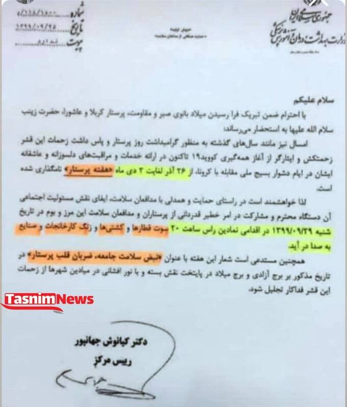به گزارش پایگاه خبری تحلیلی گرو، وزارت بهداشت پیشنهاد داد در راستای بزرگداشت روز پرستار (۳۰ آذر) راس ساعت ۲۰، سوت قطارها و کشتیها و زنگ کارخانجات و صنایع به صدا درآید.