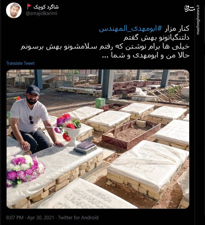 به گزارش پایگاه خبری تحلیلی گرو، یک کاربر توئیتر با انتشار عکسی نوشت: کنار مزار ابومهدی المهندس دلتنگیاتونو بهش گفتم. خیلی ها برام نوشتن که رفتم سلامشونو بهش برسونم. حالا من و ابومهدی و شما ...