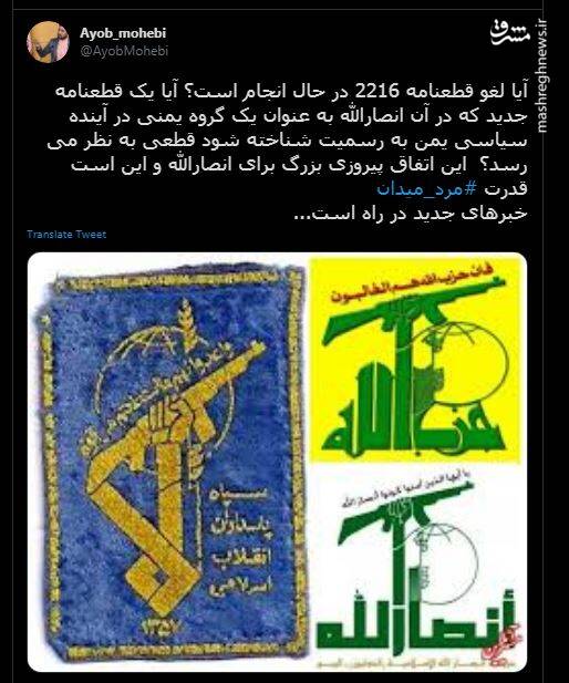 به گزارش پایگاه خبری تحلیلی گرو، یک کاربر در توئیتی نوشت: آیا لغو قطعنامه ۲۲۱۶ در حال انجام است؟ آیا یک قطعنامه جدید که در آن انصارالله به عنوان یک گروه یمنی در آینده سیاسی یمن به رسمیت شناخته شود قطعی به نظر می رسد؟ این اتفاق پیروزی بزرگ برای انصارالله است. این است قدرت مرد میدان.