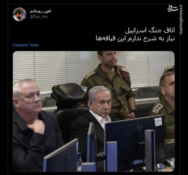 به گزارش پایگاه خبری تحلیلی گرو، یک کاربر با انتشار عکسی در توئیتی نوشت: اتاق جنگ اسراییل؛ نیاز به شرح ندارم این قیافه ها.