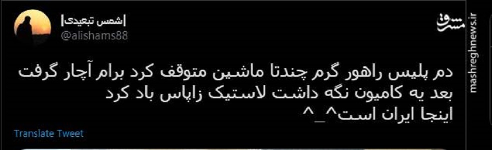 به گزارش پایگاه خبری تحلیلی گرو، یک کاربر در توئیتی نوشت: دم پلیس راهور گرم چند تا ماشین رو متوقف کرد، برام آچار گرفت، بعد یه کامیون رو نگه داشت، لاستیک زاپاس باد کرد. اینجا ایران است.
