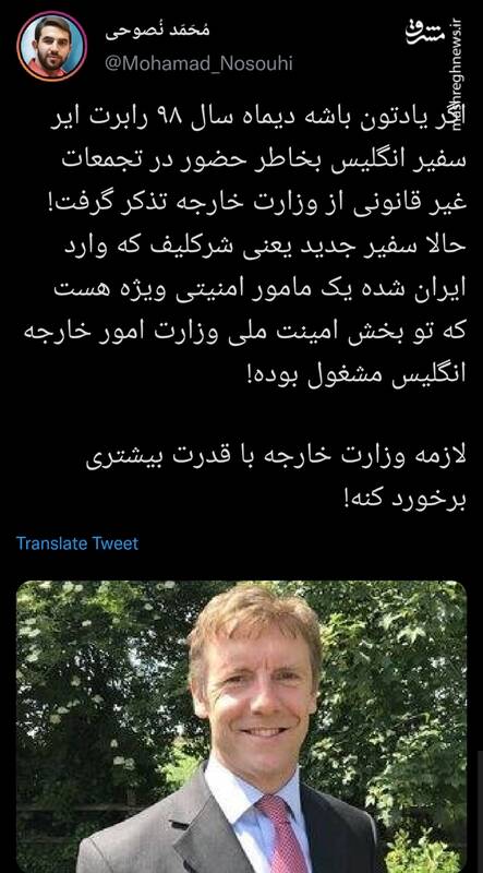 به گزارش پایگاه خبری تحلیلی گرو، یک کاربر فضای مجازی در توییتر نوشت: اگر یادتون باشه دیماه سال ۹۸ رابرت ایر سفیر انگلیس بخاطر حضور در تجمعات غیر قانونی از وزارت خارجه تذکر گرفت!