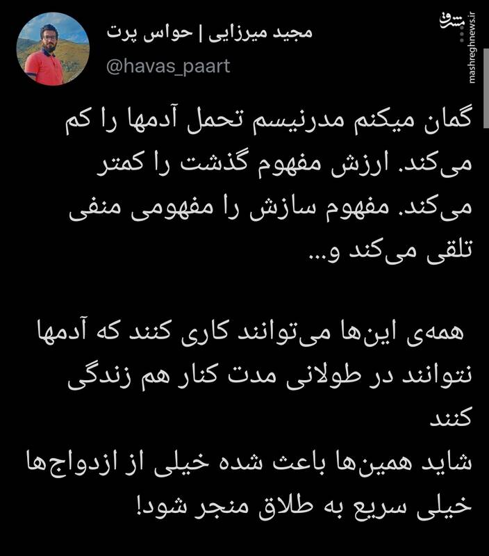به گزارش پایگاه خبری تحلیلی گرو، یک کاربر فضای مجازی در توییتر نوشت: گمان میکنم مدرنیسم تحمل آدمها را کم میکند. ارزش مفهوم گذشت را کمتر میکند. مفهوم سازش را مفهومی منفی تلقی میکند و...