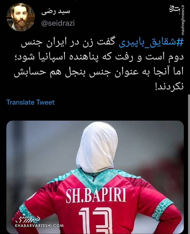 به گزارش پایگاه خبری تحلیلی گرو، کاربرفضای مجازی در توییتر نوشت: شقایق باپیری گفت زن در ایران جنس دوم است و رفت که پناهنده اسپانیا شود؛ اما آنجا به عنوان جنس بنجل هم حسابش نکردند!