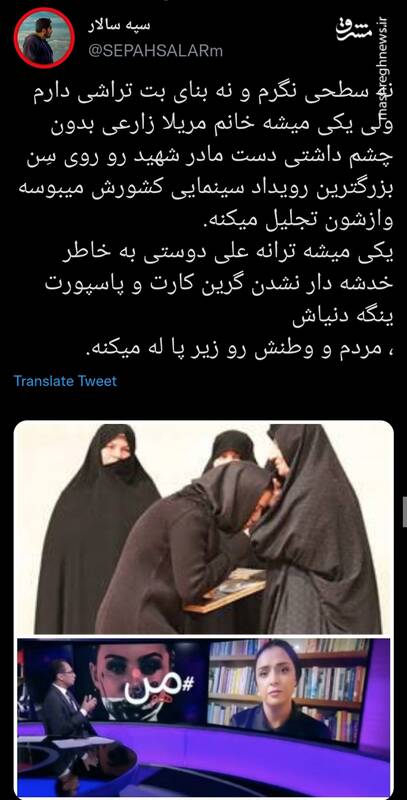 ولی یکی میشه خانم مریلا زارعی بدون چشم داشتی دست مادر شهید رو روی سِن بزرگترین رویداد سینمایی کشورش میبوسه وازشون تجلیل میکنه.