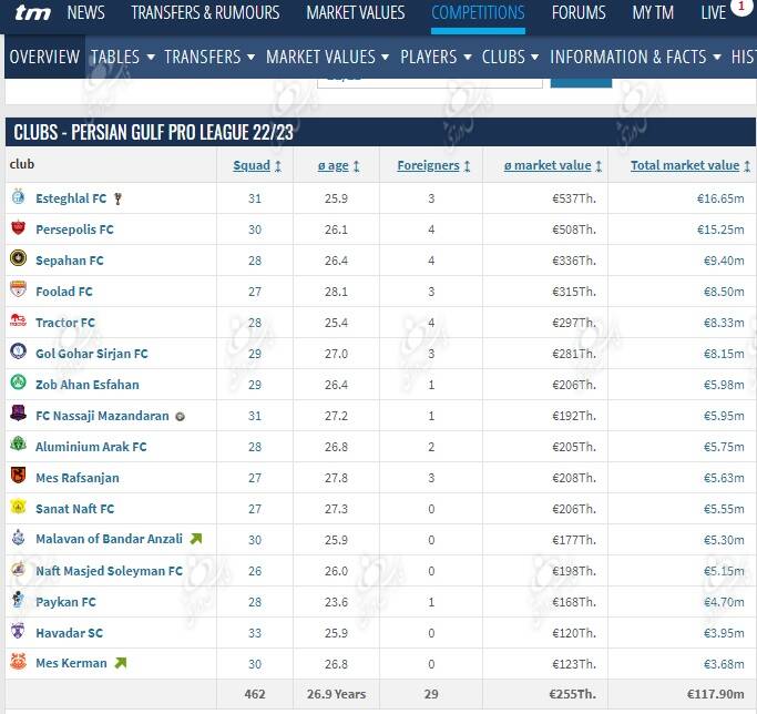 سایت «ترانسفر مارکت» قیمت تیم ها در فصل جدید لیگ ایران را به روزرسانی کرد که ارزش کل لیگ ایران ۱۱۷.۹۰ میلیون یورو شد و استقلال به عنوان گران ترین تیم لیگ ایران در فصل ۲۰۲۲-۲۰۲۳ شناخته شد.