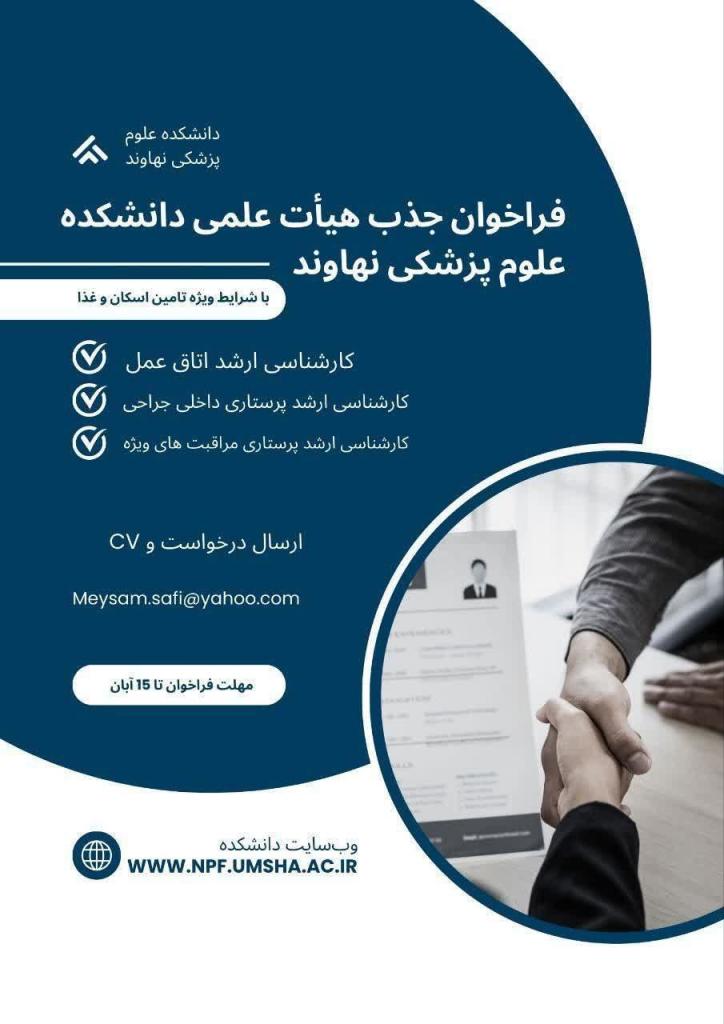 به گزارش پایگاه خبری تحلیلی گرو، دانشکده علوم پزشکی نهاوند از واجدین شرایط برای ردیفهای هیأت علمی زیر دعوت به همکاری میکند: