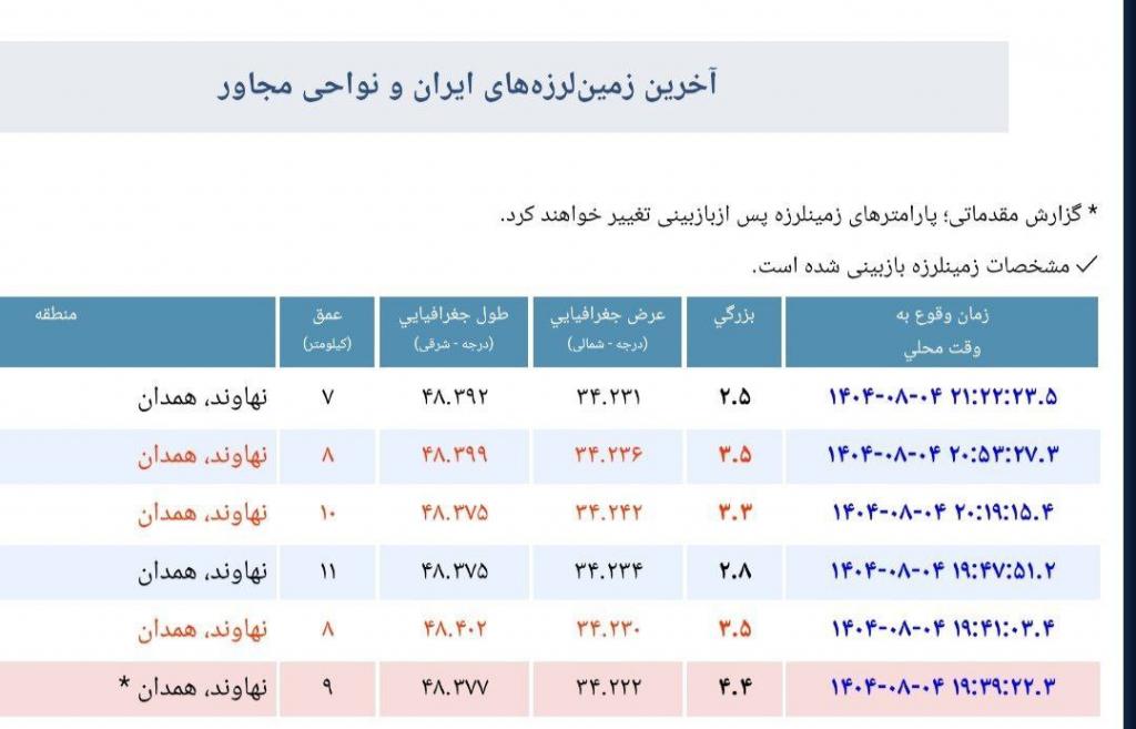 بر اساس اعلام مرکز لرزهنگاری کشور، این زمینلرزهها به ترتیب با بزرگیهای ۴.۴، دوبار۳.۵، ۳.۳ ، ۲.۸، ۲.۵ ریشتر و در عمقهای ۷ تا ۱۱ کیلومتری زمین به ثبت رسیدهاند.