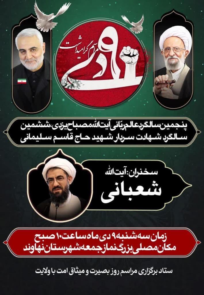 رئیس سازمان تبلیغات اسلامی نهاوند در پایان از عموم مردم شریف و ولایتمدار شهرستان نهاوند دعوت کرد تا با حضور پرشور خود، ضمن تجدید میثاق با آرمانهای انقلاب اسلامی، یاد و خاطره علامه مصباح یزدی و سردار دلها حاج قاسم سلیمانی را گرامی بدارند.
