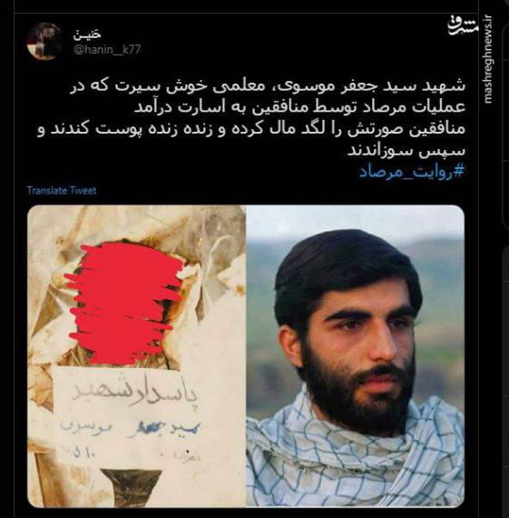 به گزارش پایگاه خبری تحلیلی گرو، یک کاربر در توئیتی نوشت: شهید سید جعفر موسوی، معلمی خوش سیرت که در عملیات مرصاد توسط منافقین به اسارت درآمد.