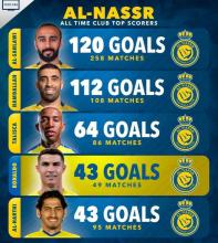 به گزارش پایگاه خبری تحلیلی گرو، رونالدو در النصر موفق به زدن 43 گل شده است تا در جدول رده بندی برترین گلزنان تاریخ النصر جایگاه چهارم را به خود اختصاص داده. با توجه به سن این ستاره پرتغالی بعید است بتواند یک رکورد جدید ثبت کند.