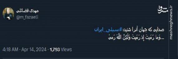 به گزارش پایگاه خبری تحلیلی گرو، مهدی فضائلی در توئیتی پس از حمله ایران به اسرائیل نوشت: