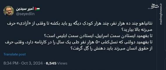 نتانیاهو چند ده هزار نفر، چند هزار کودکِ دیگه رو باید بکشه تا وقتی از «آزادی» حرف می‌زنه بالا بیارید؟ تا بفهمید ایستادن سمتِ اسراییل، ایستادن سمتِ ابلیس است؟