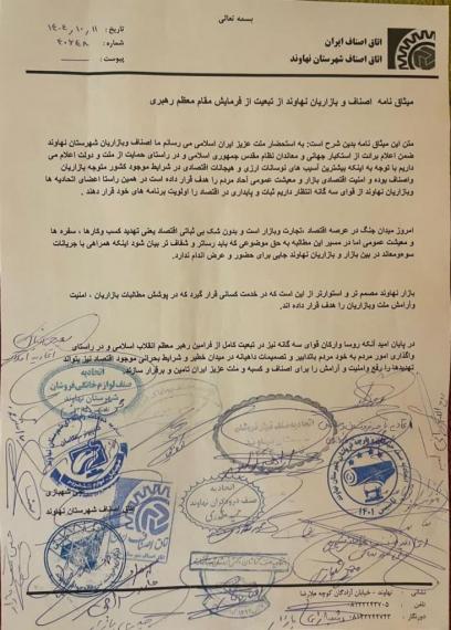 بازاریان نهاوند همچنین در این میثاقنامه بر پیگیری مطالبات و درخواستهای خود از طریق مجاری قانونی تأکید کردند.