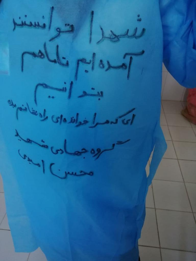 دستنوشتهها و عباراتی که این بسیجیان بر روز لباسهای خود نوشتهاند نشاندهنده عمق تفکر بسیجی در خدمترسانی به مردم است.