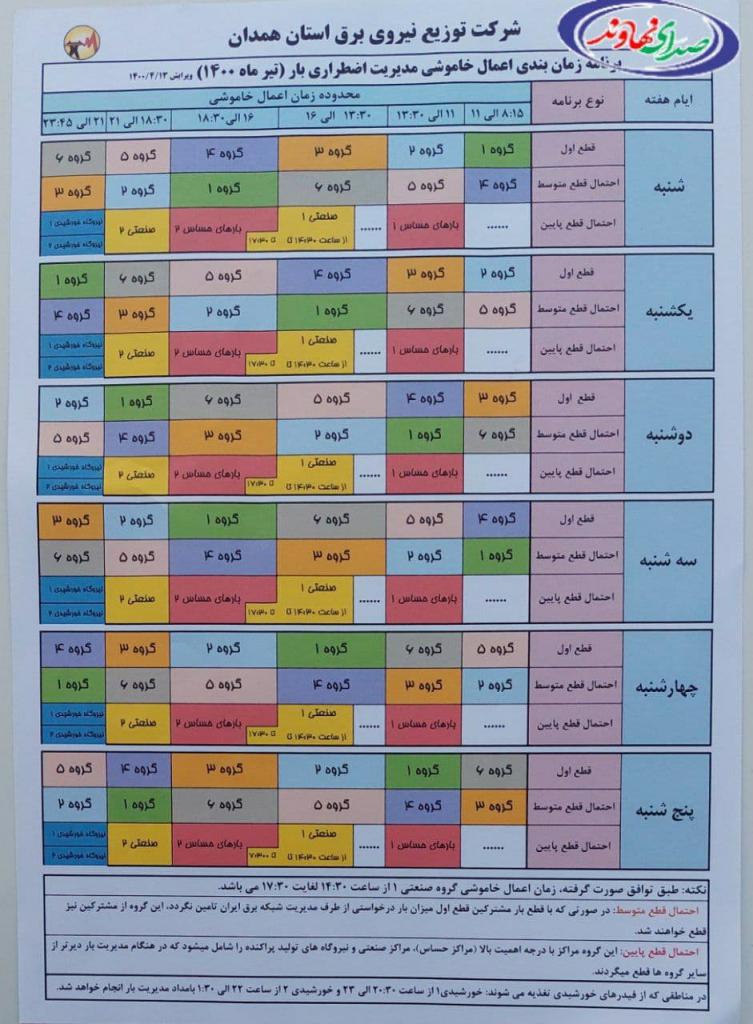 جداول جدید خاموشی ها در مناطق مختلف شهرستان نهاوند و روستاهای مختلف در 9 گروه مختلف اعلام شد.