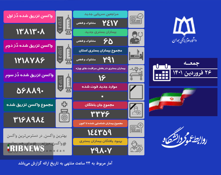 به گزارش پایگاه خبری تحلیلی گرو، دانشگاه علوم پزشکی همدان اعلام کرد: با شناسایی ۶۵ بیمار بستری جدید مشکوک و قطعی مبتلا به کرونا، شمار بیماران بستری در بیمارستانهای استان همدان به ۲۹۱ نفر رسید.