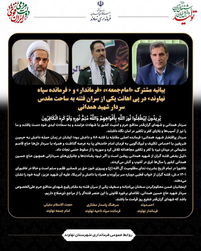 اینجانبان ضمن محکومکردن سخنان بیادبانه و سخیف یکی از سران فتنه به مقام رفیع شهدای مدافع حرم علیالخصوص سردار شهید حاج حسین همدانی، تقاضای برخورد قانونی با این عنصر فتنهگر را از مراجع ذیصلاح داریم. باشد که شهدای گرانقدر شفیع روز قیامت ما باشند.