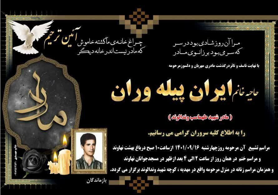 به گزارش پایگاه خبری تحلیلی گرو، «ایران پیله وران» مادر شهید «طهماسب وندالوند» پس از سالها فراغ فرزندش روز (سهشنبه) آسمانی شد و به فرزند شهیدش پیوست.