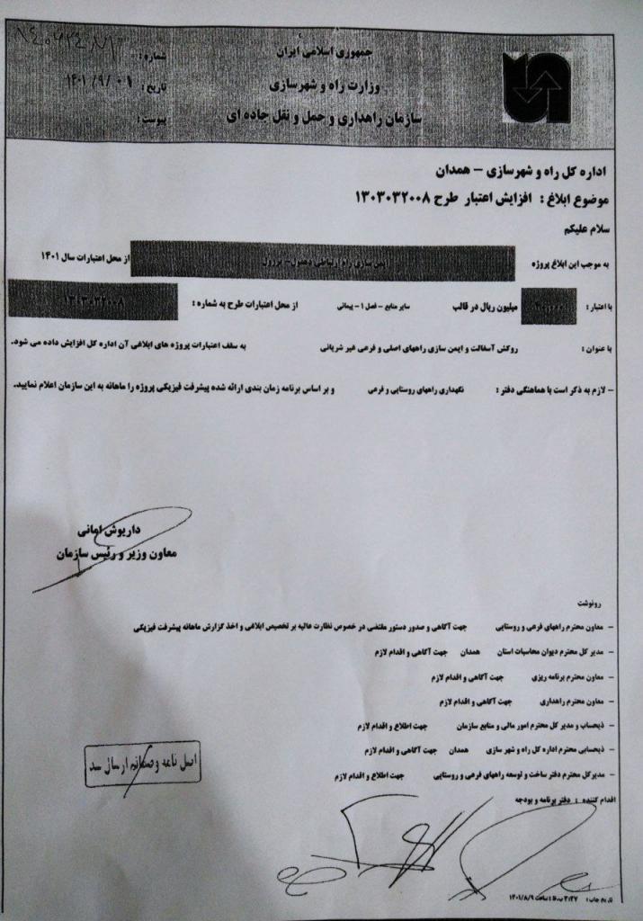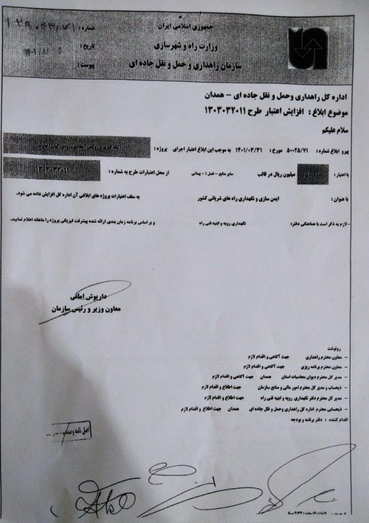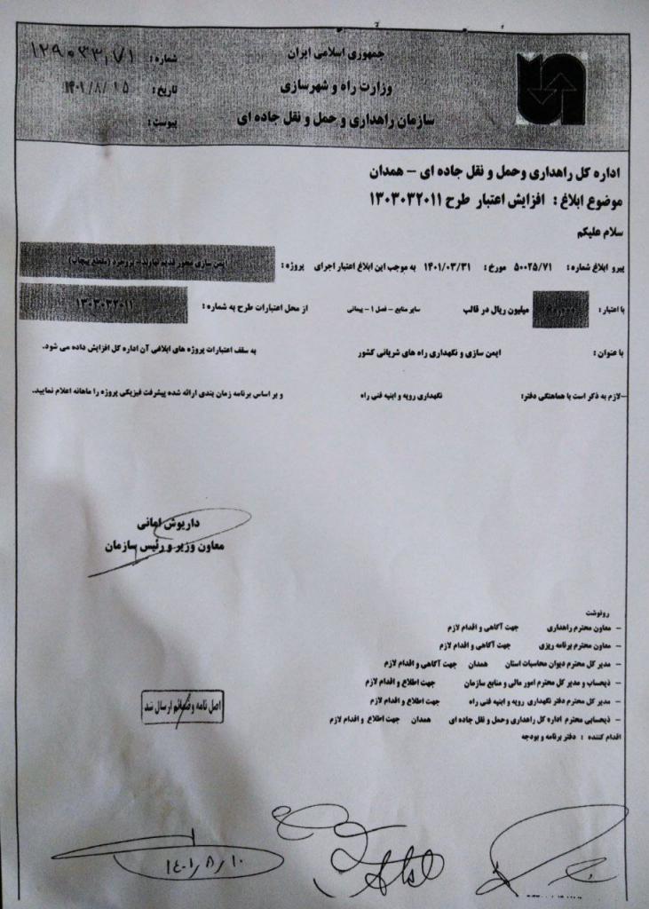 افزایش اعتبار ایمن سازی محور قدیم نهاوند به بروجرد ( حد فاصل پیچاب تا کوهانی) به میزان ۶ میلیارد تومان