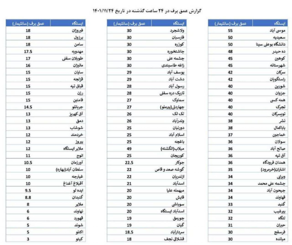 این سامانه چندمین سامانه بارشی در زمستان امسال است که بارشهای خیلی خوب و پر و پیمانی را به ارمغان آورده. حالا اگر بعد از حدود ۲۴ ساعت از آغاز بارشها به آمار و ارقام استحصال شده متوسل شویم درخواهیم یافت که ارتفاع برف در یکصد ایستگاه هواشناسی به شرح زیر است.