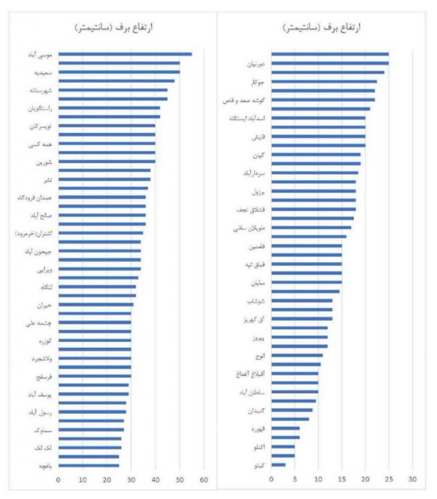 در موسیآباد اسدآباد ۵۵ سانتیمتر و منطقه سعیدیه همدان ۵۰ سانتیمتر ثبت شده است، همچنین دهحیدر شهرستان نهاوند ۴۸ سانتیمتر، کوهین شهرستان کبودراهنگ ۴۵ سانتیمتر و در شهرستان تویسرکان ۴۵ سانتیمتر بارش برف گزارش شده که در سالهای خشک اخیر بیسابقه بوده است.