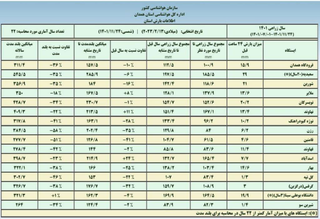 چنانچه درصدد مقایسه سال زراعی جاری با سال گذشته برآییم به جدول زیر خواهیم رسید، به نحوی که بارش ۲۴ ساعت گذشته ایستگاههای هواشناسی استان همدان با سال زارعی قبل و بلند مدت مقایسه شده است.