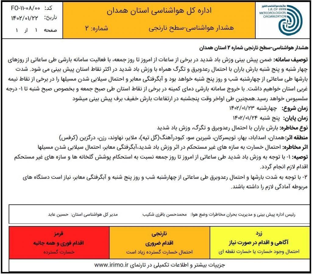 مدیرکل هواشناسی استان همدان با اشاره به صدور هشدار نارنجی، تصریح کرد: تمهیدات لازم برای این پدیده باید درنظر گرفته شود و در این زمینه هشدار نارنجی صادر شده است.