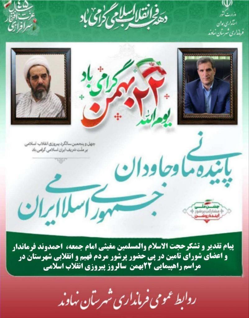 به گزارش پایگاه خبری تحلیلی گرو، حجت الاسلام والمسلمین مغیثی امام جمعه ، احمدوند فرماندار شهرستان نهاوند واعضای شورای تامین شهرستان نهاوند در پی حضور پرشور مردم فهیم و انقلابی و مسئولین شهرستان در مراسم راهپیمایی 22بهمن سالروز پیروزی انقلاب اسلامی پیام تشکر و قدردانی صادر کردند: