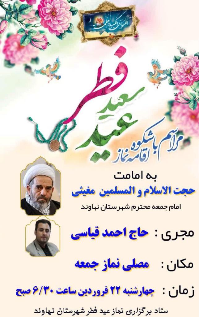 این مرازم به شکرانه یک ماه عبادت و روزهداری به امامت حجت الاسلام والمسلمین عباسعلی مغیثی امام جمعه محترم شهرستان نهاوند اقامه می شود.