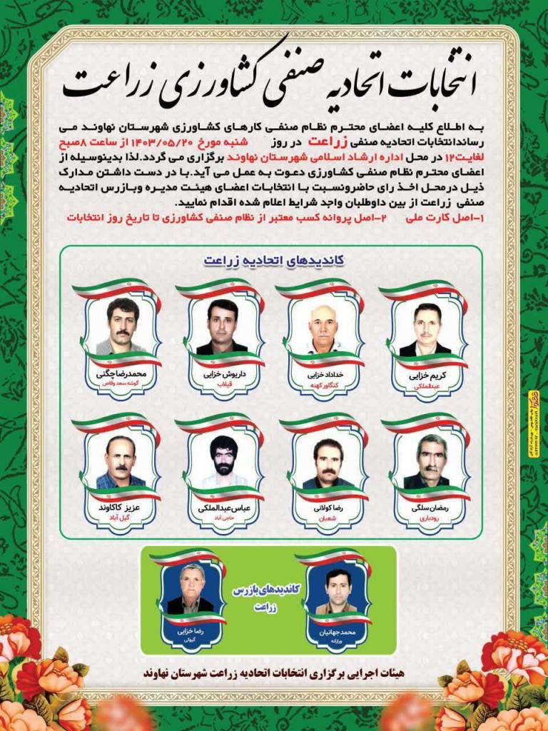 انتخابات نوبت دوم اتحادیه های صنفی کشاورزی نهاوندجهت تشکیل سه اتحادیه صنفی کشاورزی شامل اتحادیه زراعت،باغبانی،(دامداری وزنبورداری به صورت همگن) در روز شنبه مورخ ۲۰ مردادماه در سالن فرهنگ وارشاد اسلامی از ساعت ۸الی ۱۲ظهربرگزار می شود.