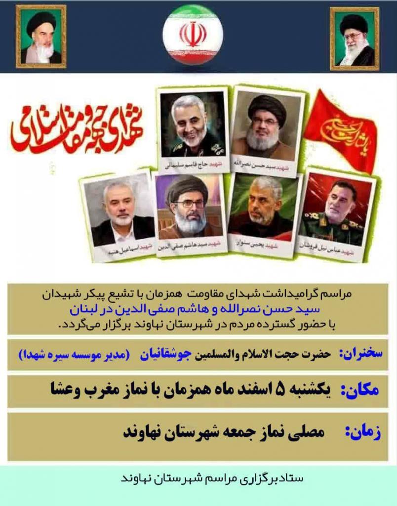 مراسم گرامیداشت شهید نصرالله در مصلی نماز جمعه شهرستان نهاوند با سخنرانی حجت الاسلام جوشقانیان برگزار میشود.