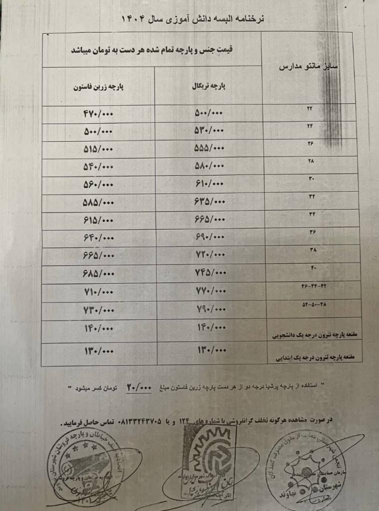 به گزارش پایگاه خبری تحلیلی گرو، نرخنامه لباس فرم مدارس دخترانه و پسرانه شهرستان نهاوند به شرح تصویر فوق میباشد: