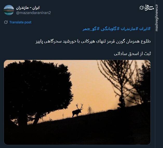 به گزارش پایگاه خبری تحلیلی گرو، صفحه توئیتری ایران مازندران تصویری با عنوان طلوع همزمان گوزن قرمز تنهای هیرکانی با خورشید سحرگاهی پاییز منتشر کرد: